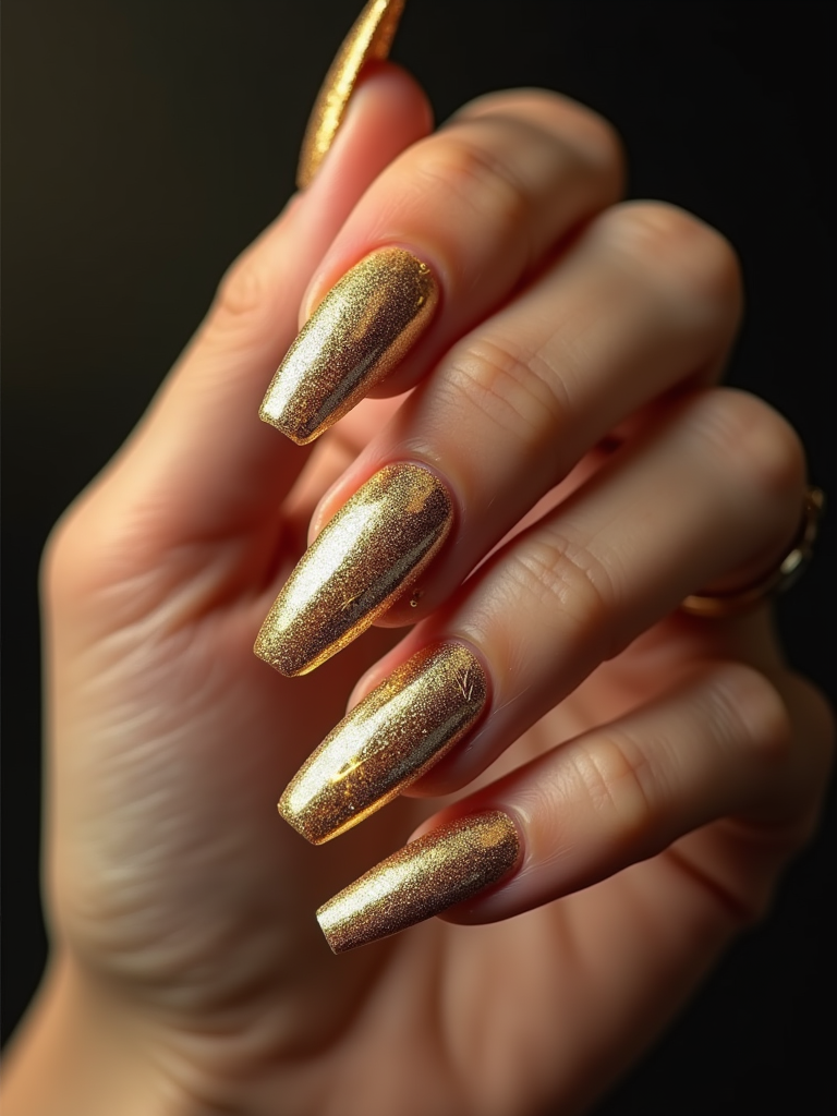 glamorous gold leaf nail art, high-shine texture, dramatic close-up, elegant hand pose, luxury beauty photography