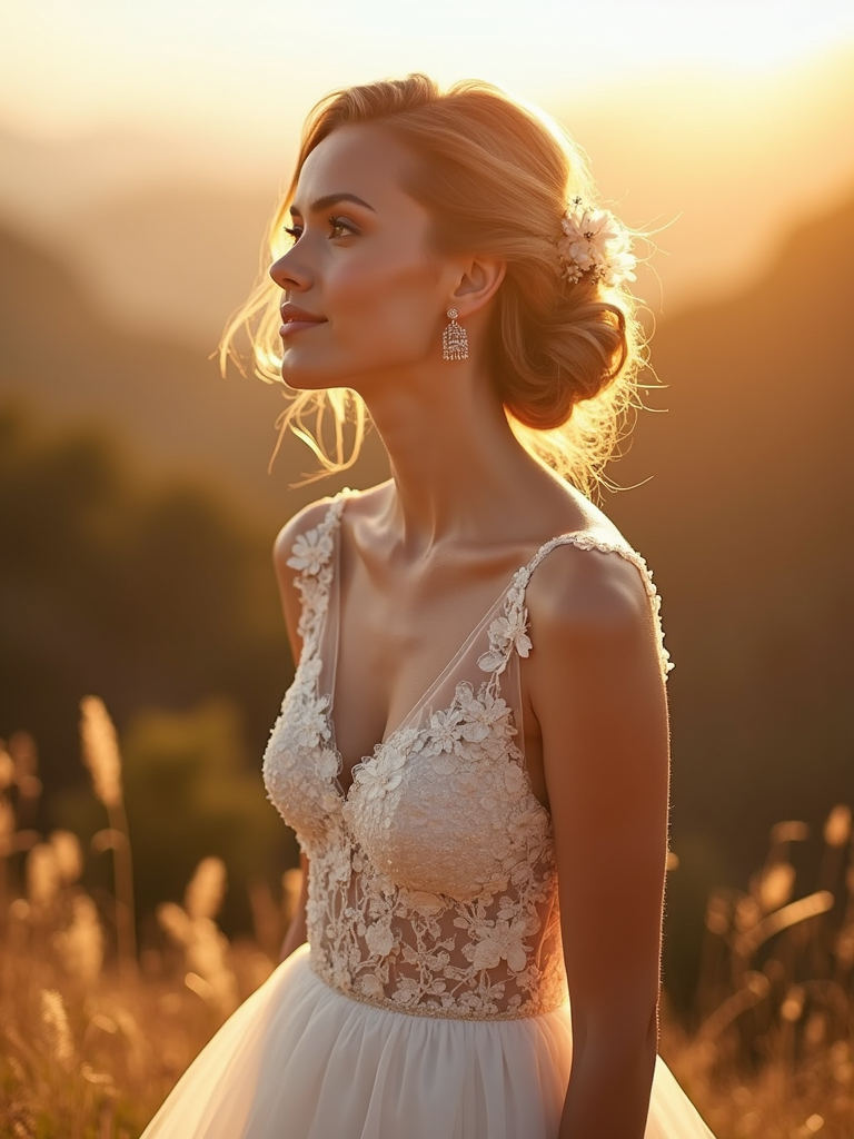 Golden hour wedding shoot with breathtaking natural scenery. Model wearing a delicate white dress with floral accents . Warm sunlight creating a dreamy ambiance.