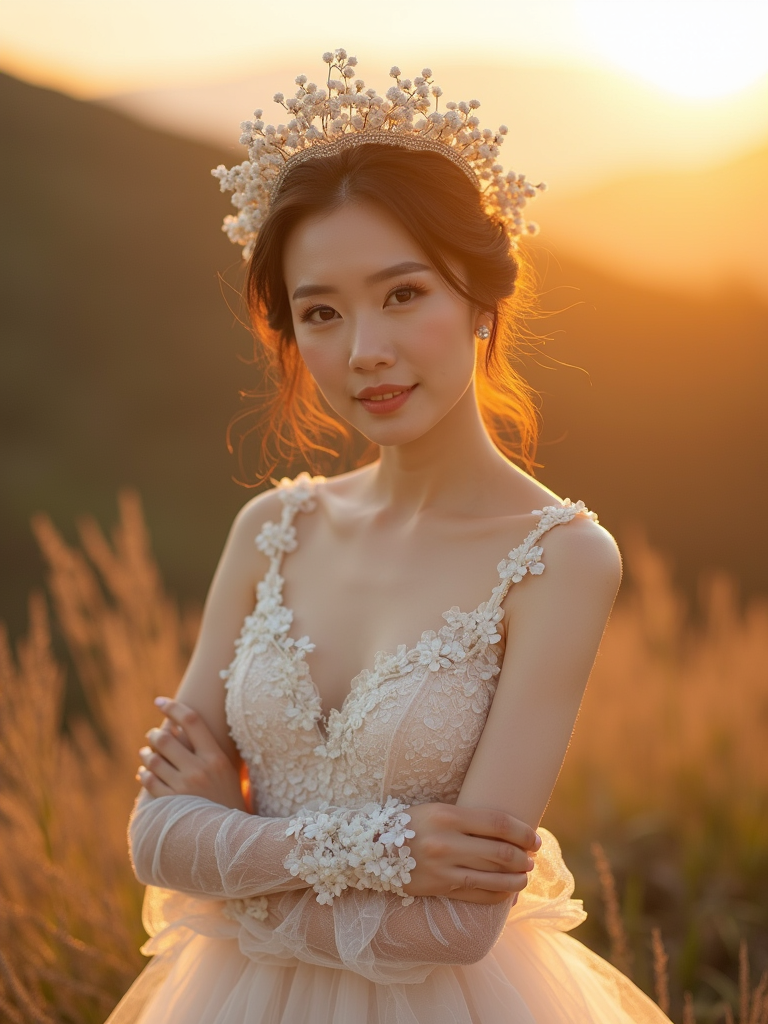 Golden hour wedding shoot with breathtaking natural scenery. Model wearing a delicate white dress with floral accents . Warm sunlight creating a dreamy ambiance.
