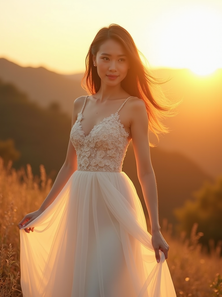 Golden hour wedding shoot with breathtaking natural scenery. Model wearing a delicate white dress with floral accents . Warm sunlight creating a dreamy ambiance.
