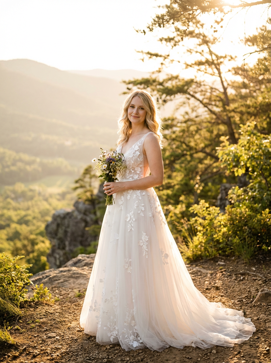 Golden hour wedding shoot with breathtaking natural scenery. Model wearing a delicate white dress with floral accents . Warm sunlight creating a dreamy ambiance.
