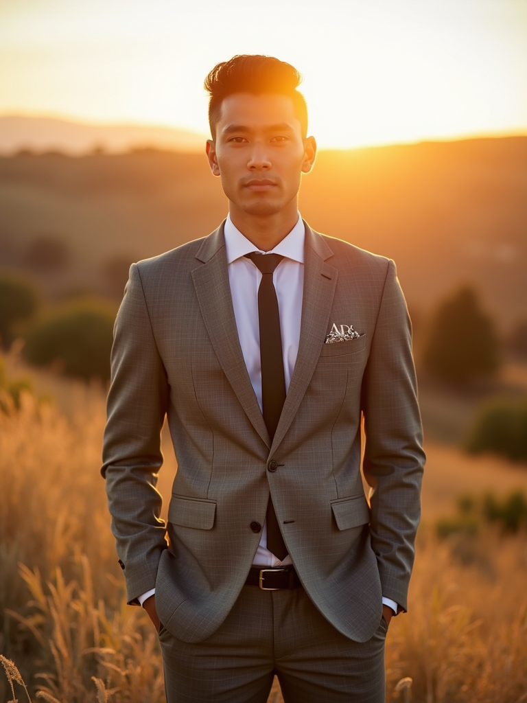 Golden hour wedding shoot with breathtaking natural scenery. Model wearing a grey checkered suit . Warm sunlight creating a dreamy ambiance.