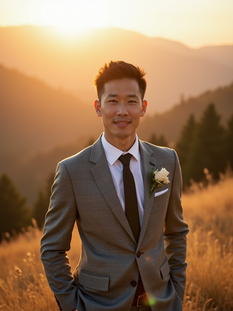 Golden hour wedding shoot with breathtaking natural scenery. Model wearing a grey checkered suit . Warm sunlight creating a dreamy ambiance.