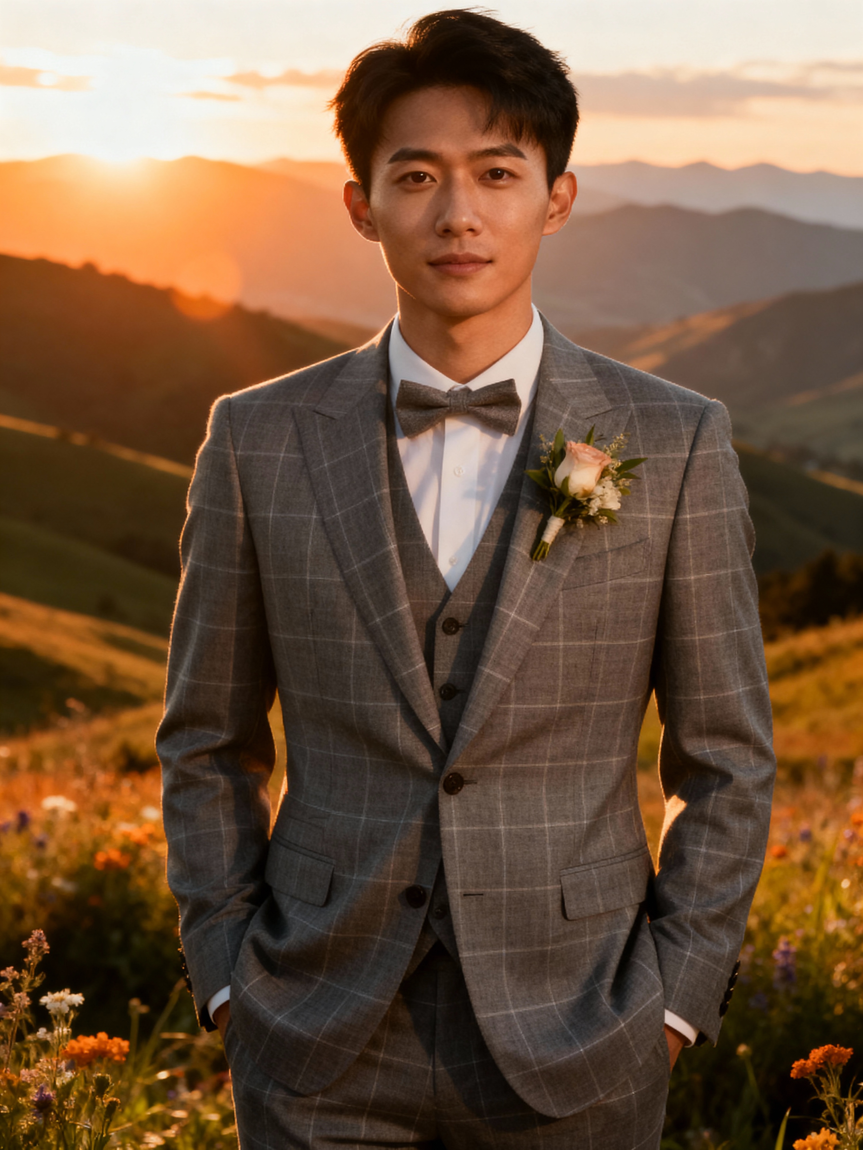 Golden hour wedding shoot with breathtaking natural scenery. Model wearing a grey checkered suit with boutonnière . Warm sunlight creating a dreamy ambiance.