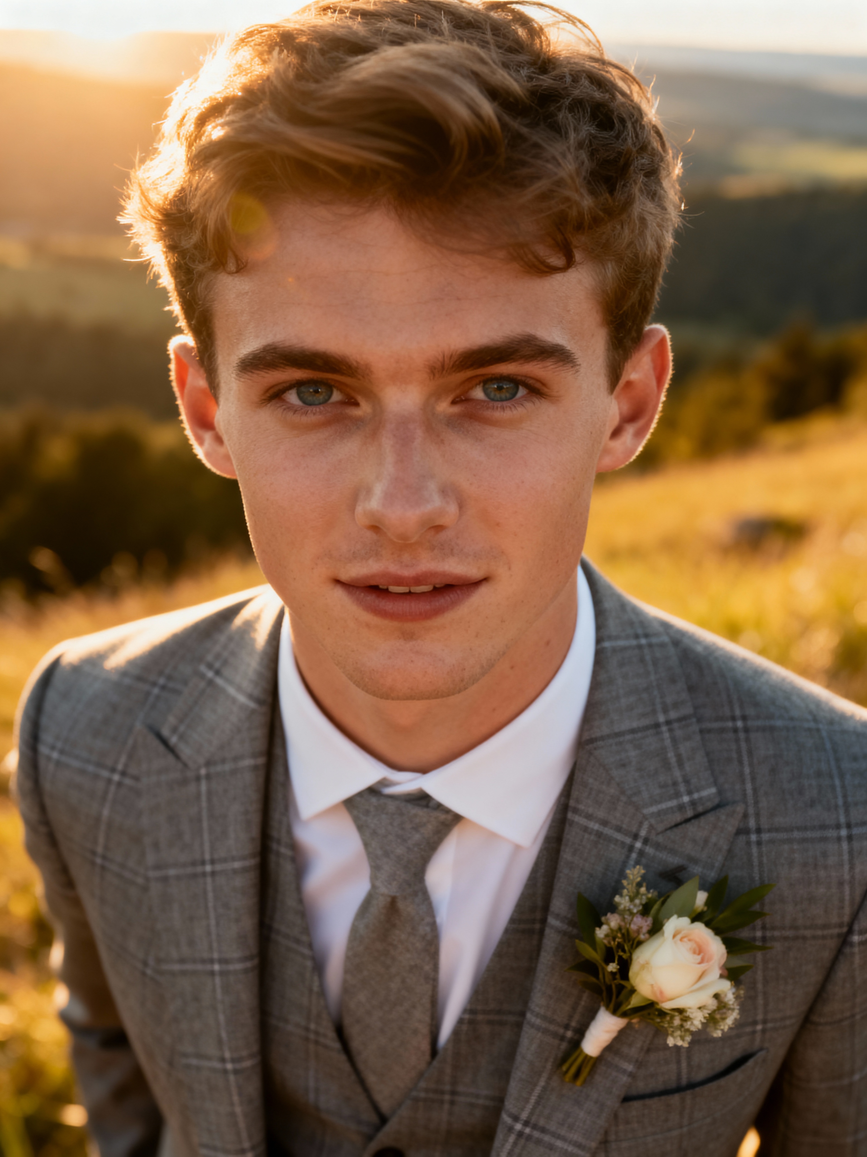 Golden hour wedding shoot with breathtaking natural scenery. Model wearing a grey checkered suit with boutonnière . Warm sunlight creating a dreamy ambiance.