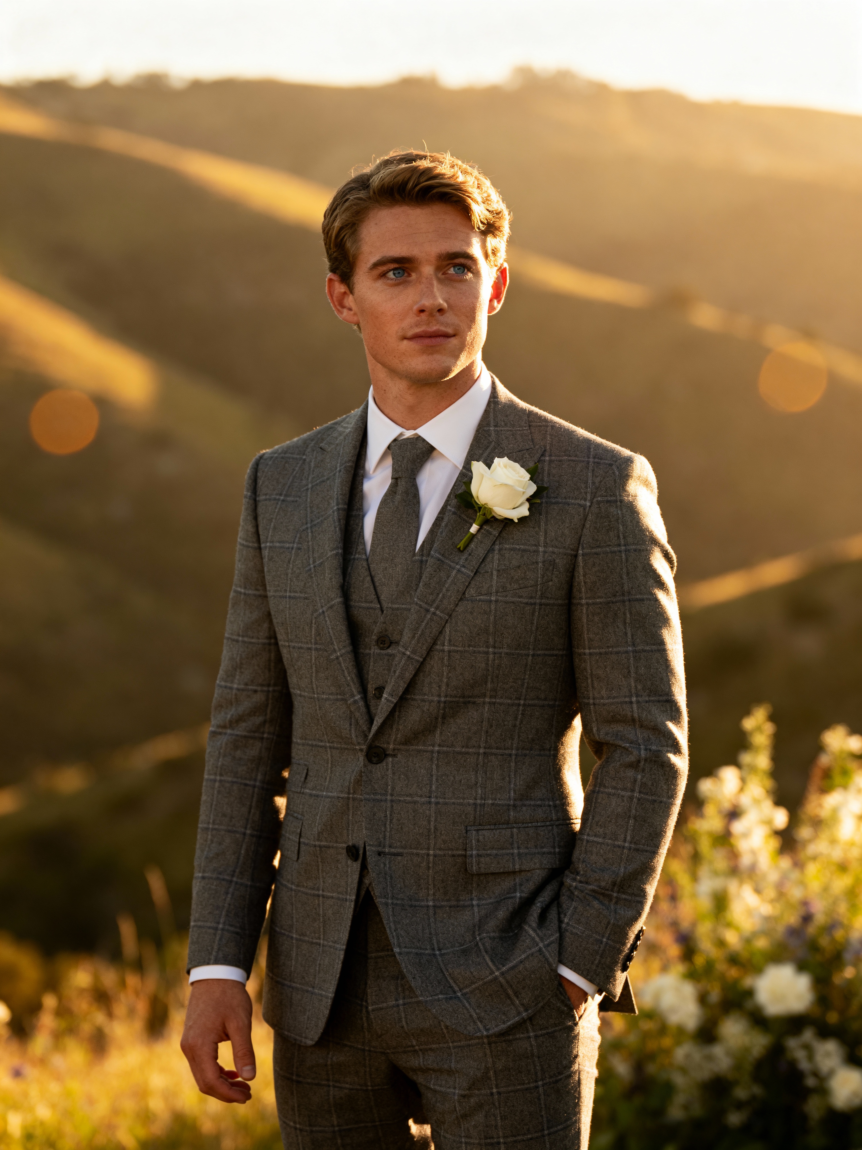 Golden hour wedding shoot with breathtaking natural scenery. Model wearing a grey checkered suit with boutonnière . Warm sunlight creating a dreamy ambiance.