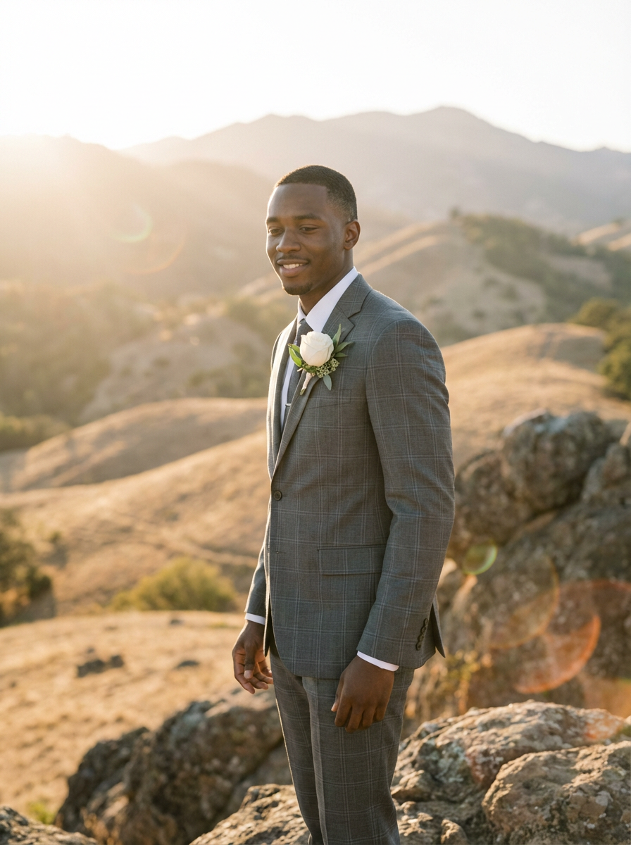 Golden hour wedding shoot with breathtaking natural scenery. Model wearing a grey checkered suit with boutonnière . Warm sunlight creating a dreamy ambiance.
