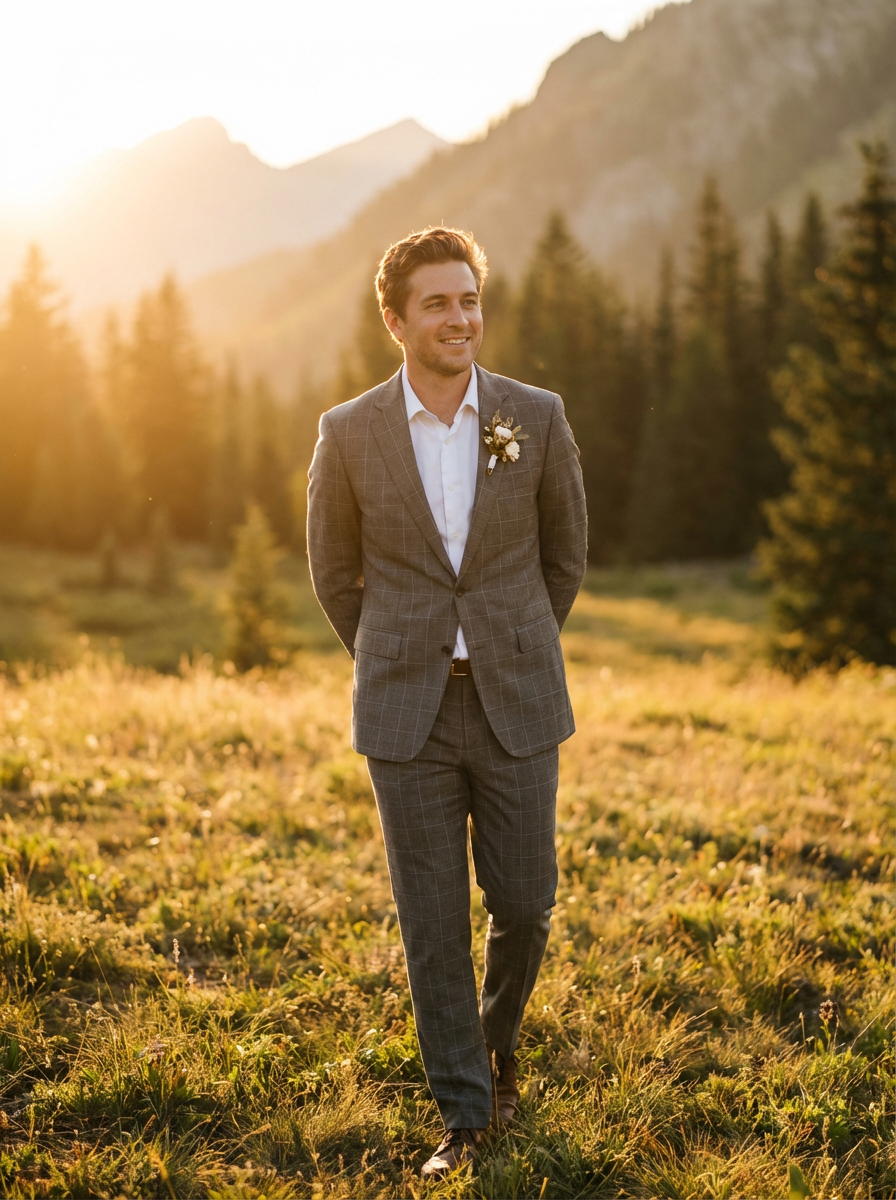 Golden hour wedding shoot with breathtaking natural scenery. Model wearing a grey checkered suit with boutonnière . Warm sunlight creating a dreamy ambiance.