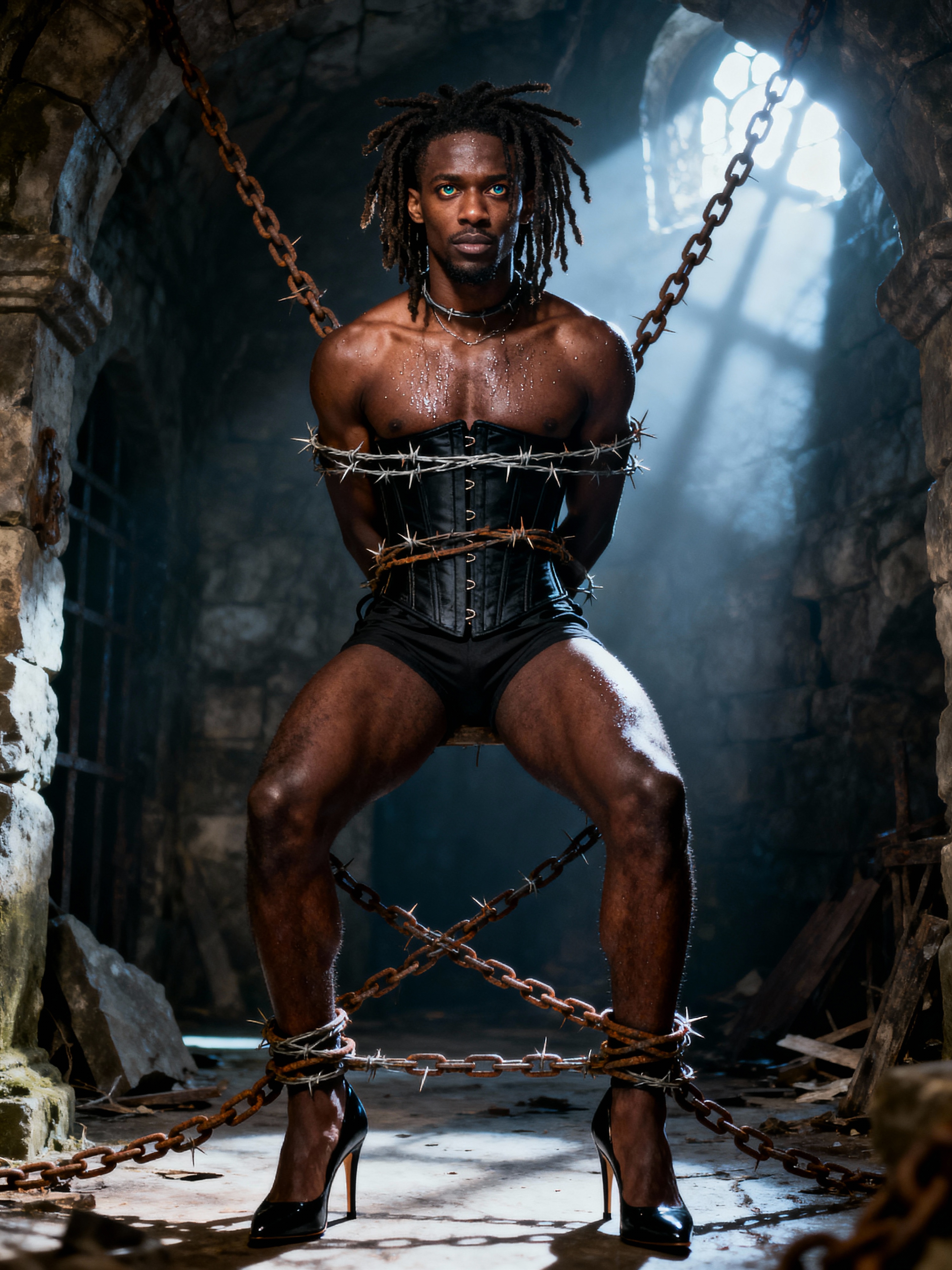 gothic model, bound by chains and barbed wire in a dungeon, very tight corset, high heels