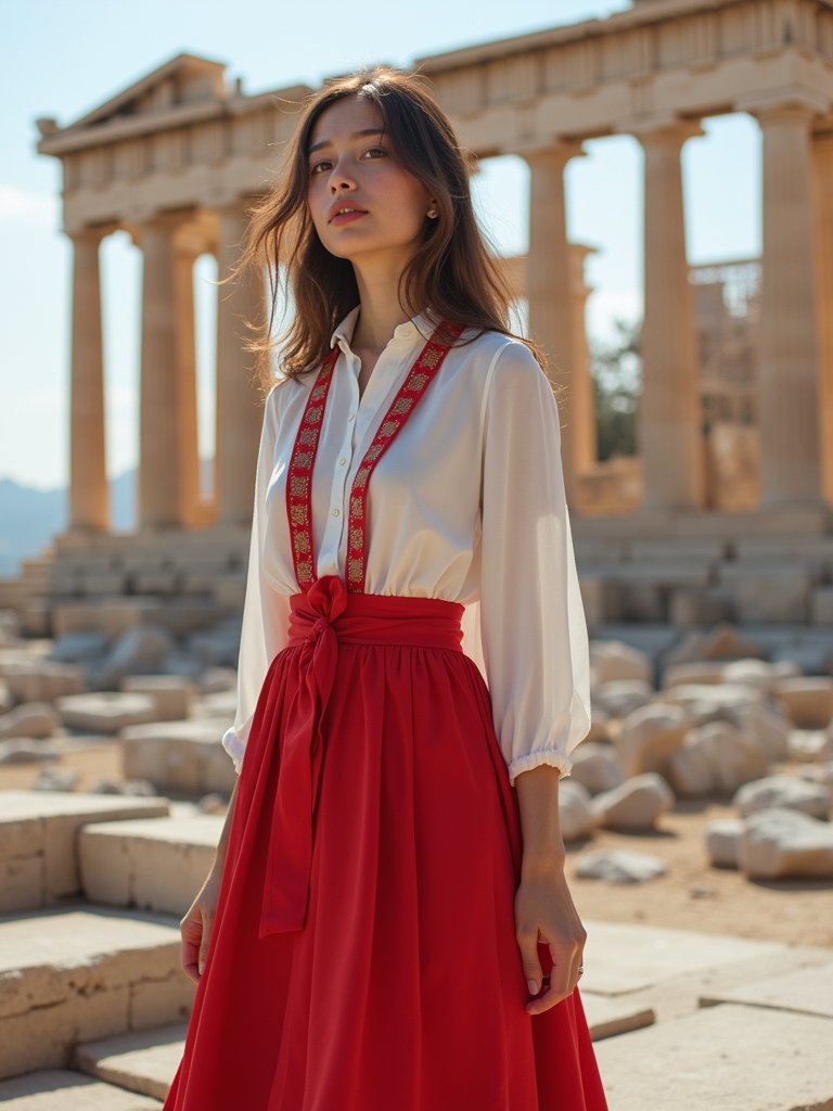 graceful and striking model in Athens wearing a traditional Evzone uniform/Amalia dress, Parthenon in the background