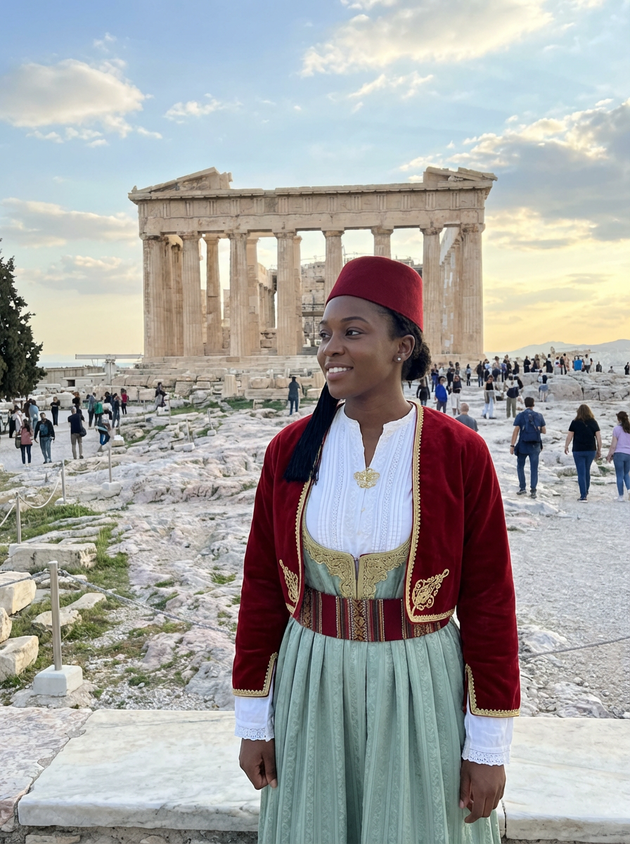 graceful and striking model in Athens wearing a traditional Evzone uniform/Amalia dress, Parthenon in the background