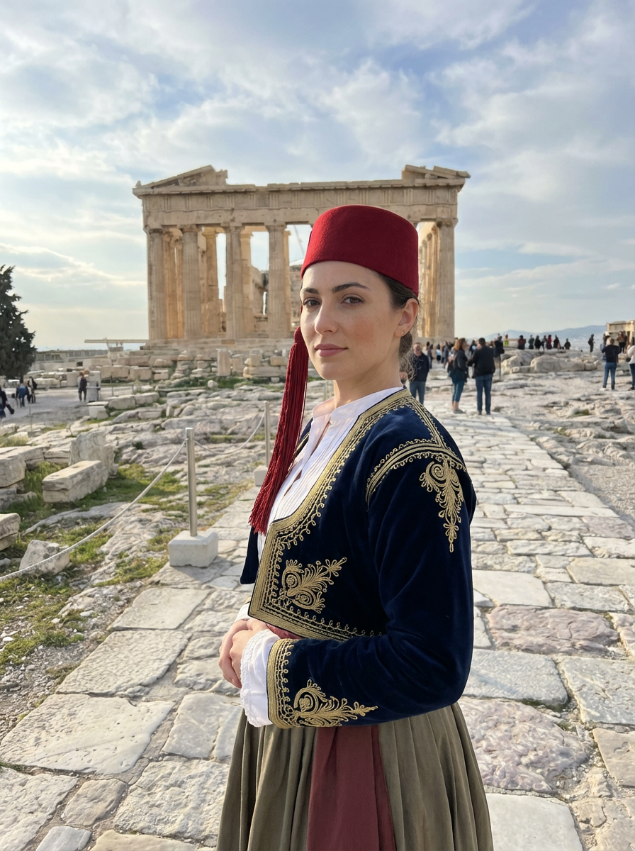 graceful and striking model in Athens wearing a traditional Evzone uniform/Amalia dress, Parthenon in the background