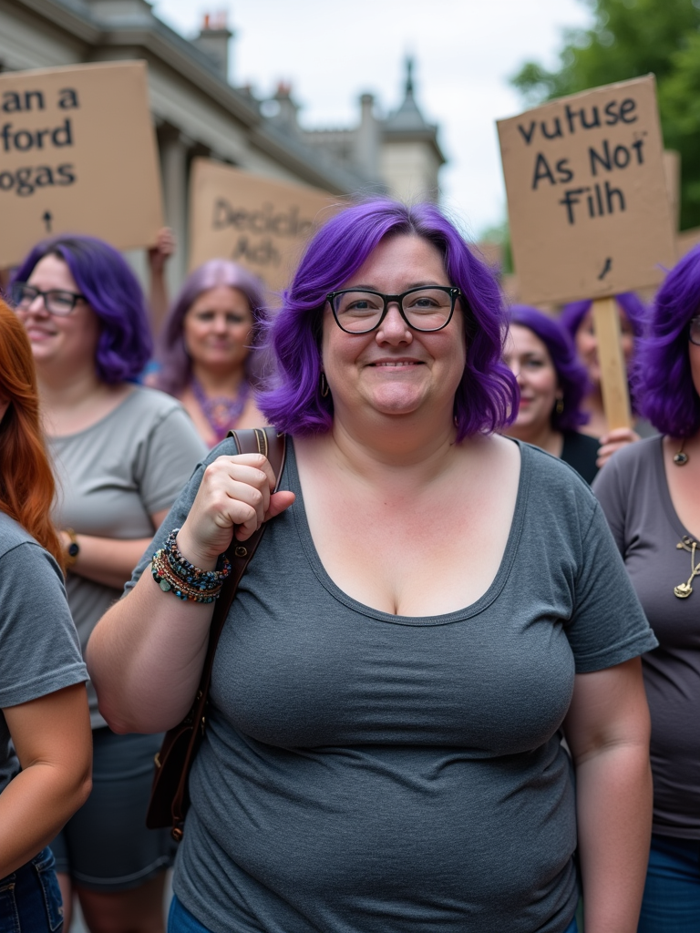 group of obese fat protesters in casual clothes with purple hair holding signs "ai is not film"
