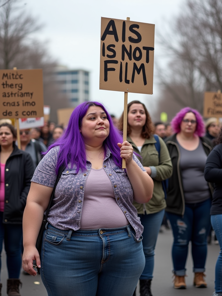 group of obese fat protesters in casual clothes with purple hair holding signs "ai is not film"