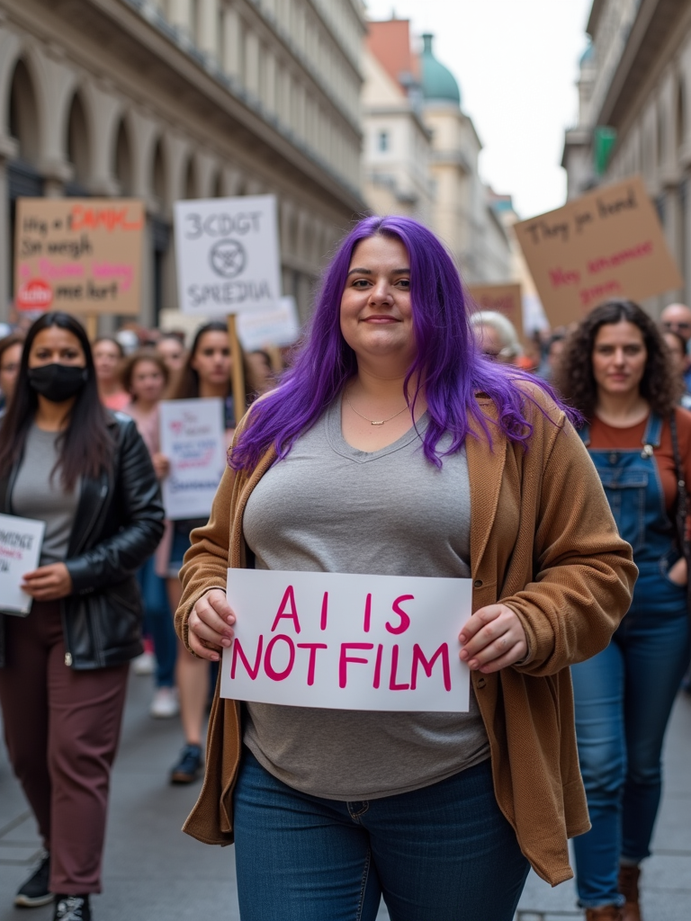 group of obese fat protesters in casual clothes with purple hair holding signs "ai is not film"
