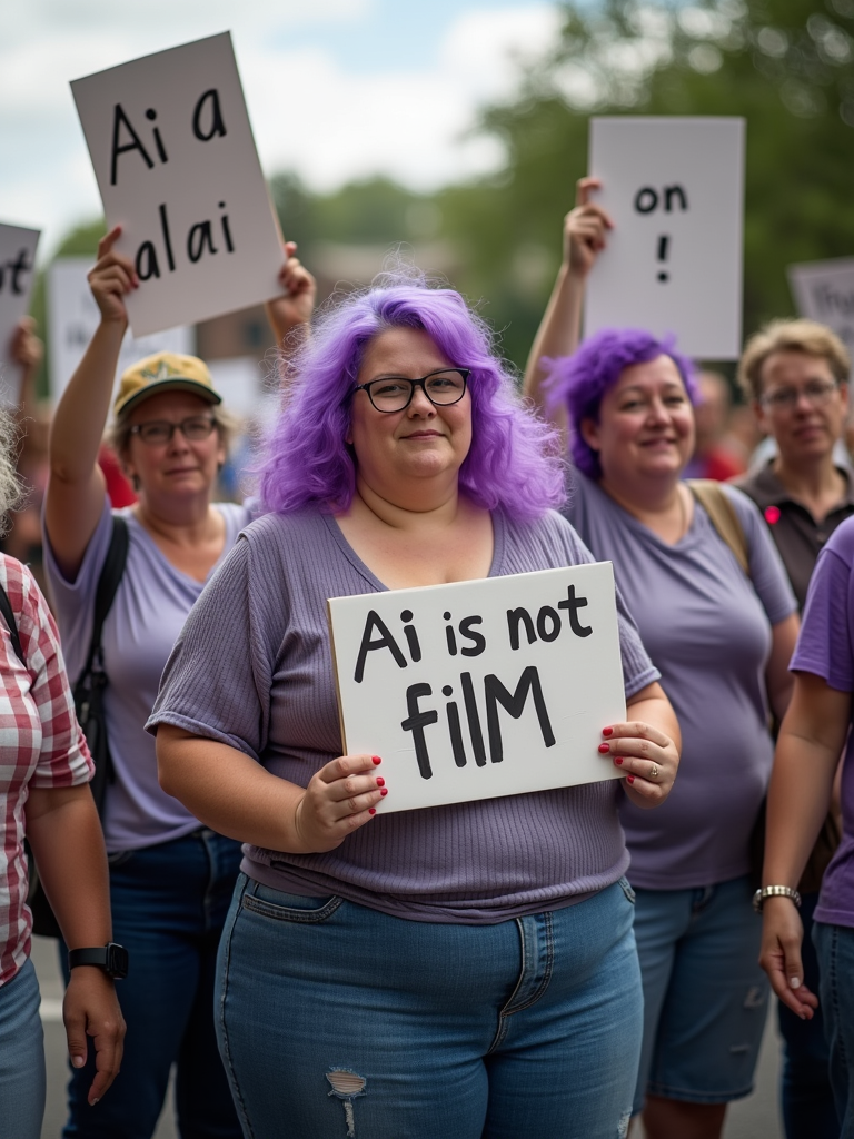 group of obese fat protesters in casual clothes with purple hair holding signs "ai is not film"