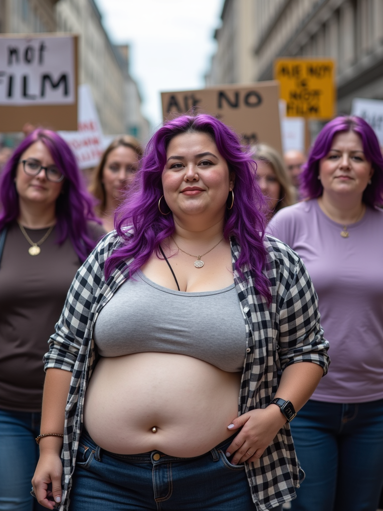 group of obese fat protesters in casual clothes with purple hair holding signs "ai is not film"