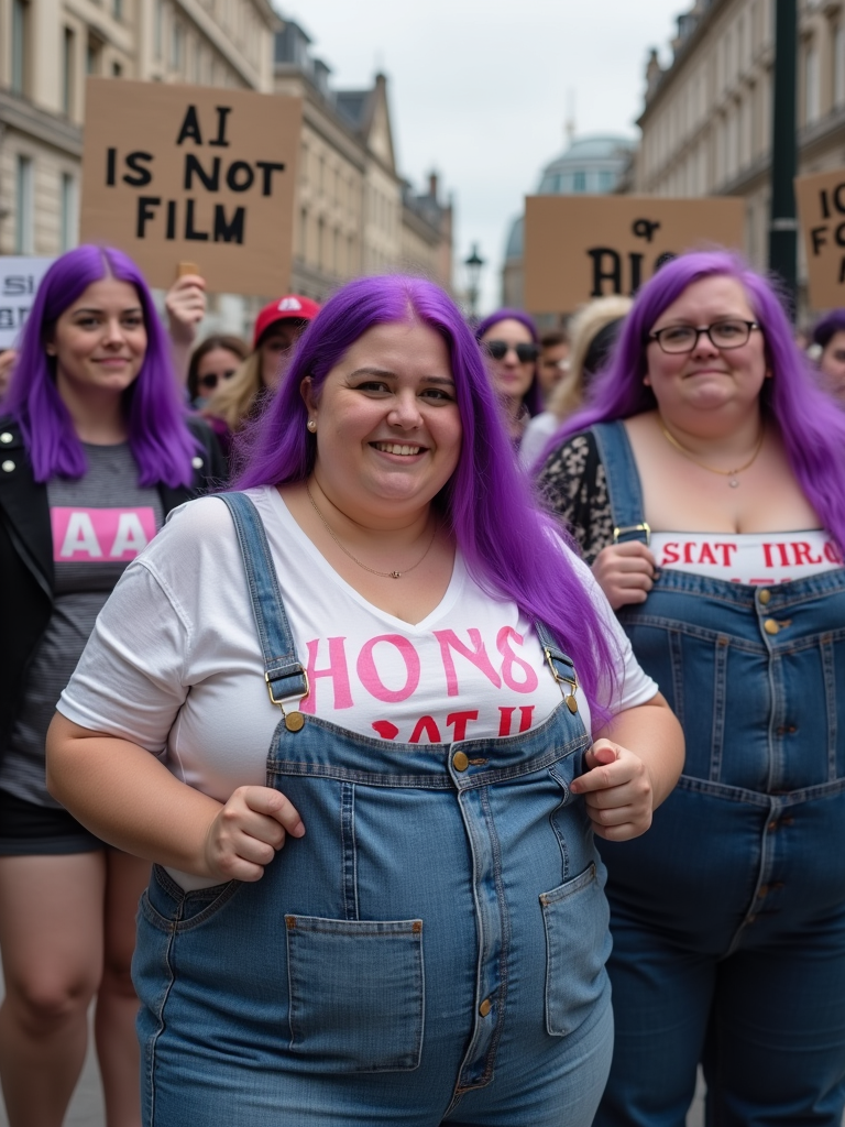 group of obese fat protesters in casual clothes with purple hair holding signs "ai is not film"
