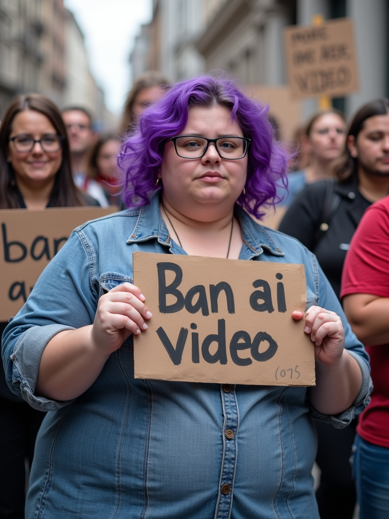 group of obese fat protesters in casual clothes with purple hair holding signs "ban ai video"