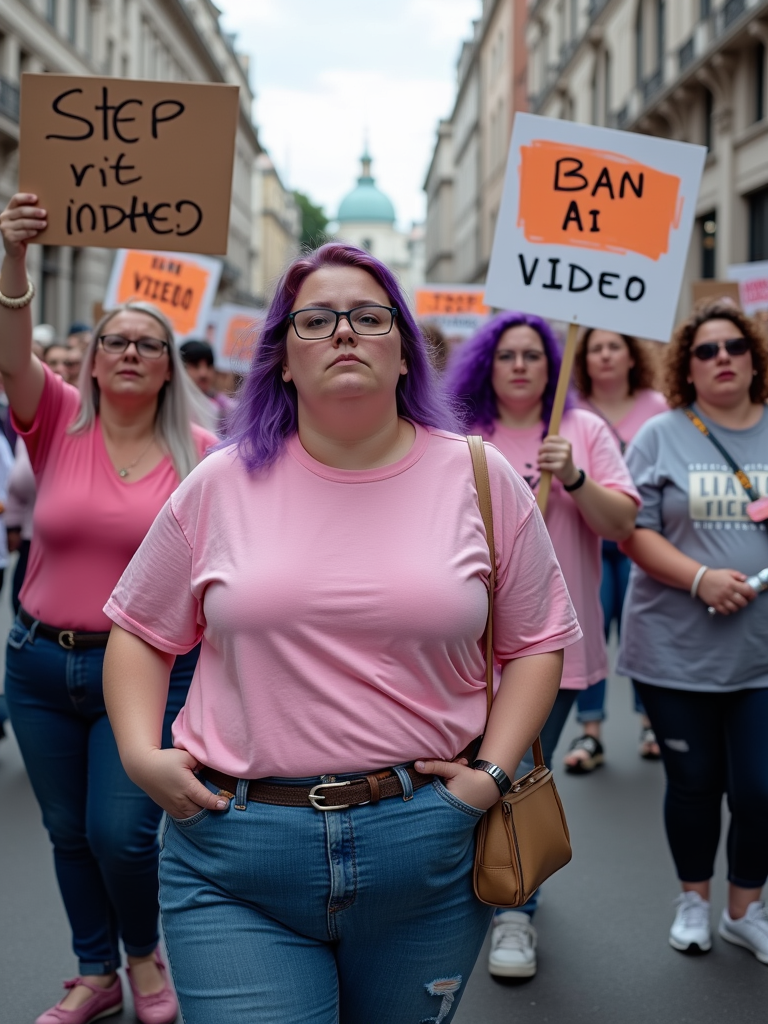 group of obese fat protesters in casual clothes with purple hair holding signs "ban ai video"