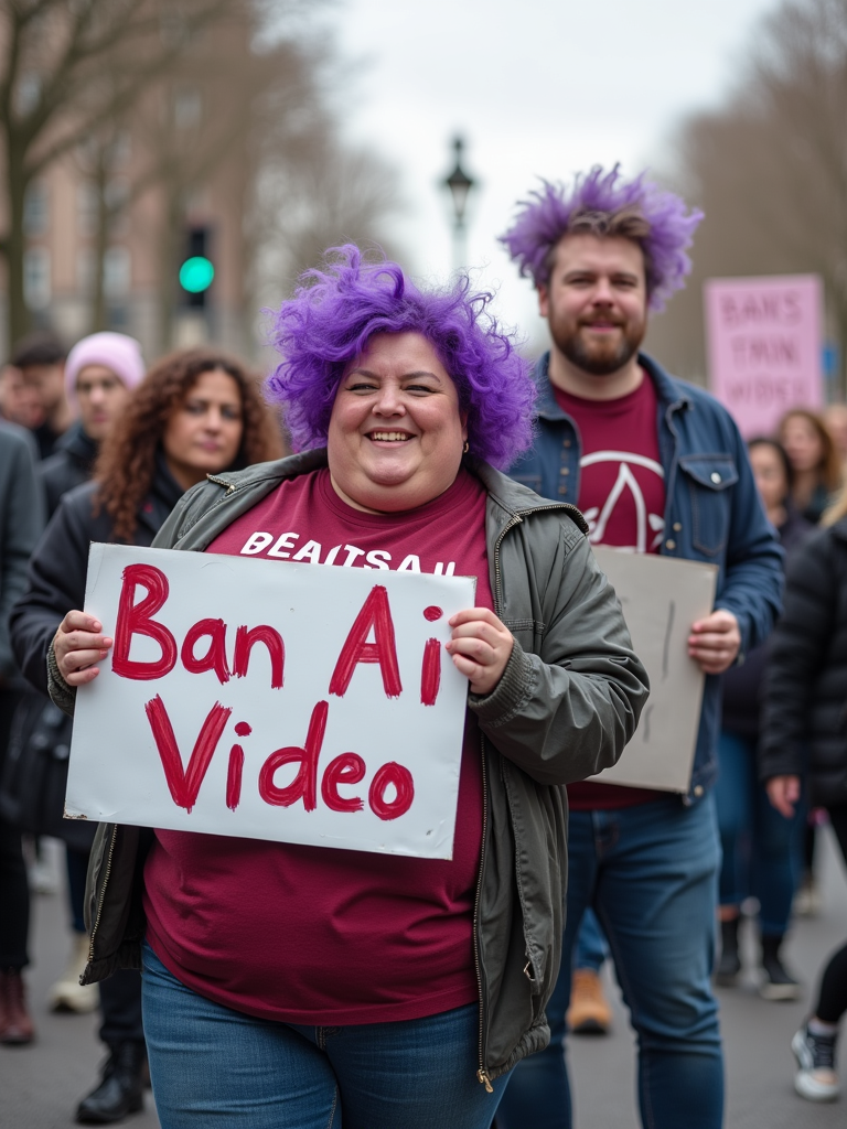 group of obese fat protesters in casual clothes with purple hair holding signs "ban ai video"