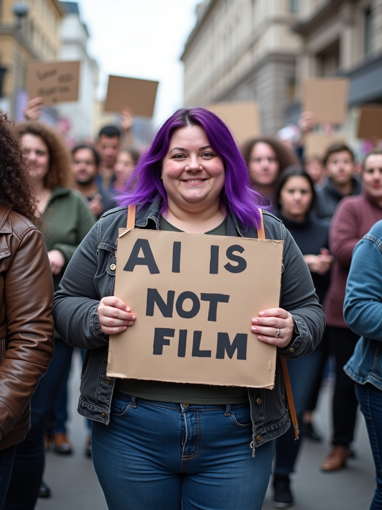 group of obese fat protesters in casual clothes with purple hair holding signs "ai is not film"