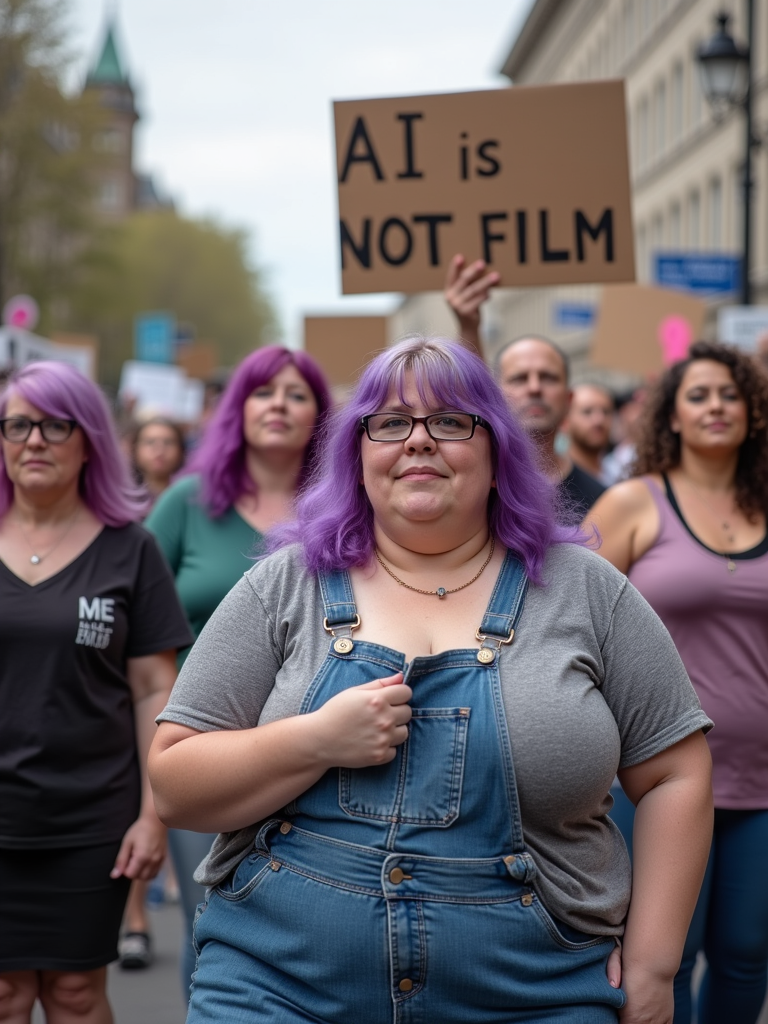 group of obese fat protesters in casual clothes with purple hair holding signs "ai is not film"