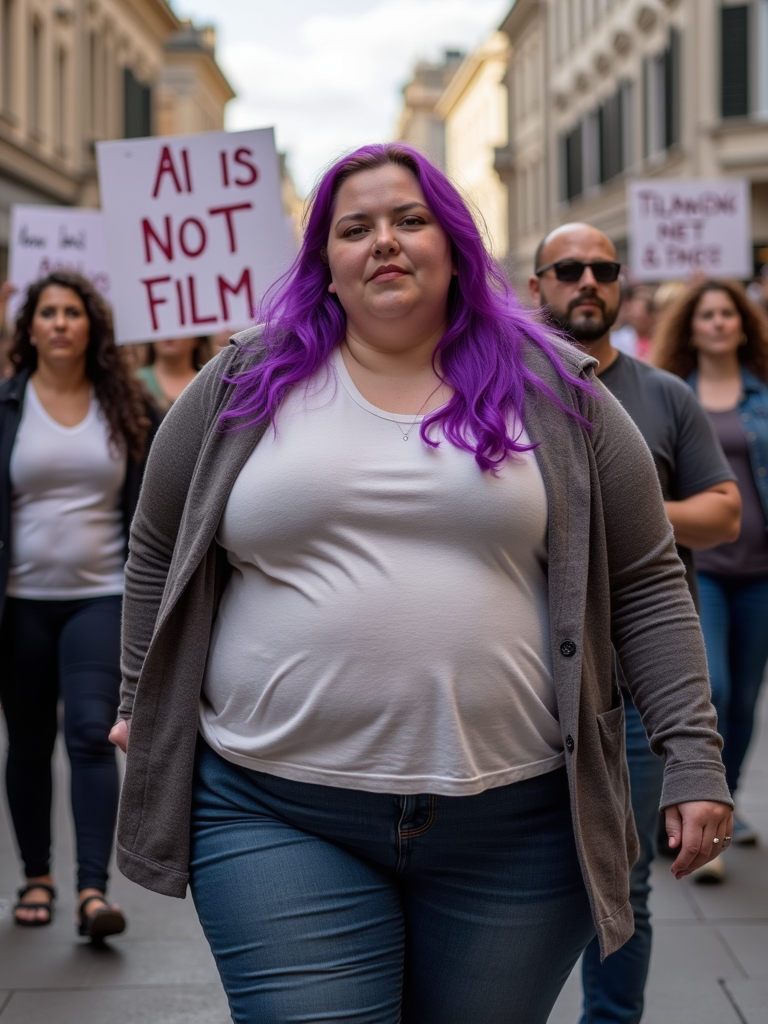 group of obese fat protesters in casual clothes with purple hair holding signs "ai is not film"