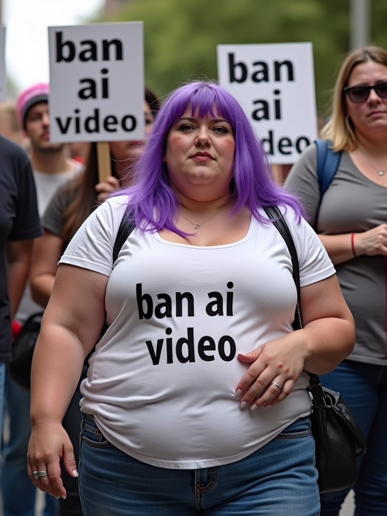 group of obese fat protesters in casual clothes with purple hair holding signs "ban ai video"