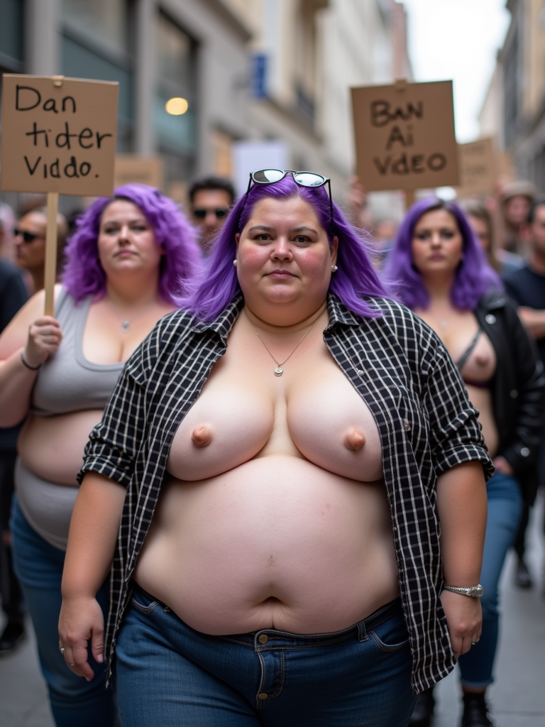 group of obese fat protesters in casual clothes with purple hair holding signs "ban ai video"