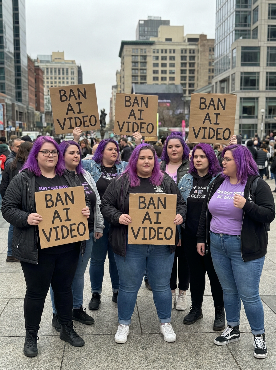 group of obese fat protesters in casual clothes with purple hair holding signs "ban ai video"
