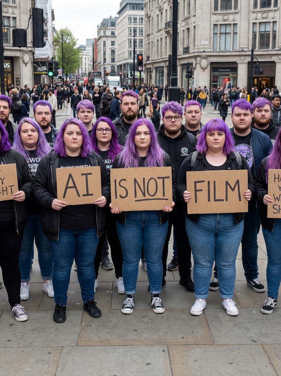 group of obese fat protesters in casual clothes with purple hair holding signs "ai is not film"