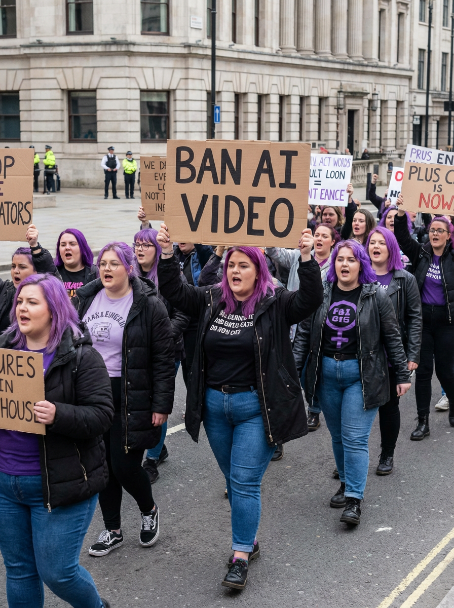 group of obese fat protesters in casual clothes with purple hair holding signs "ban ai video"