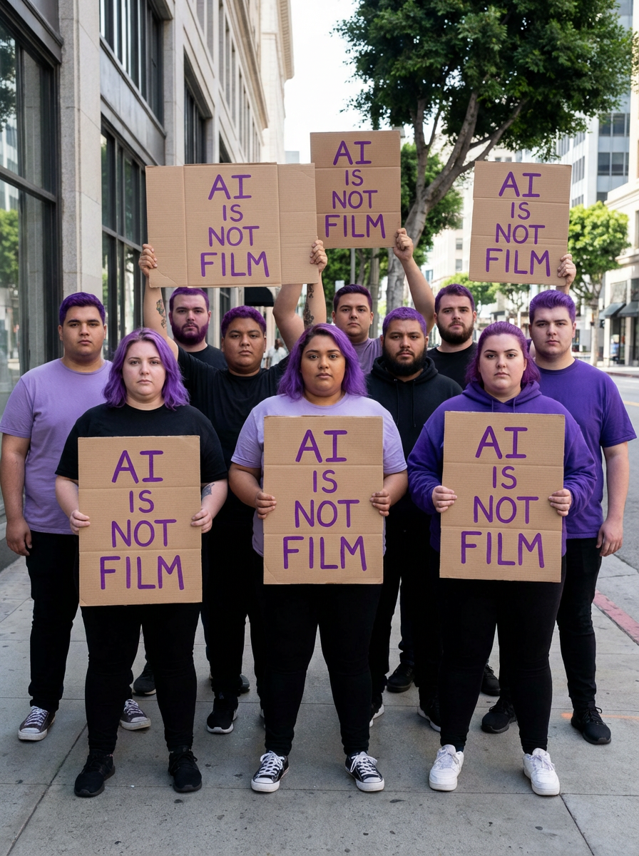 group of obese fat protesters in casual clothes with purple hair holding signs "ai is not film"