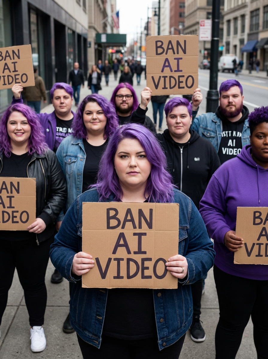 group of obese fat protesters in casual clothes with purple hair holding signs "ban ai video"