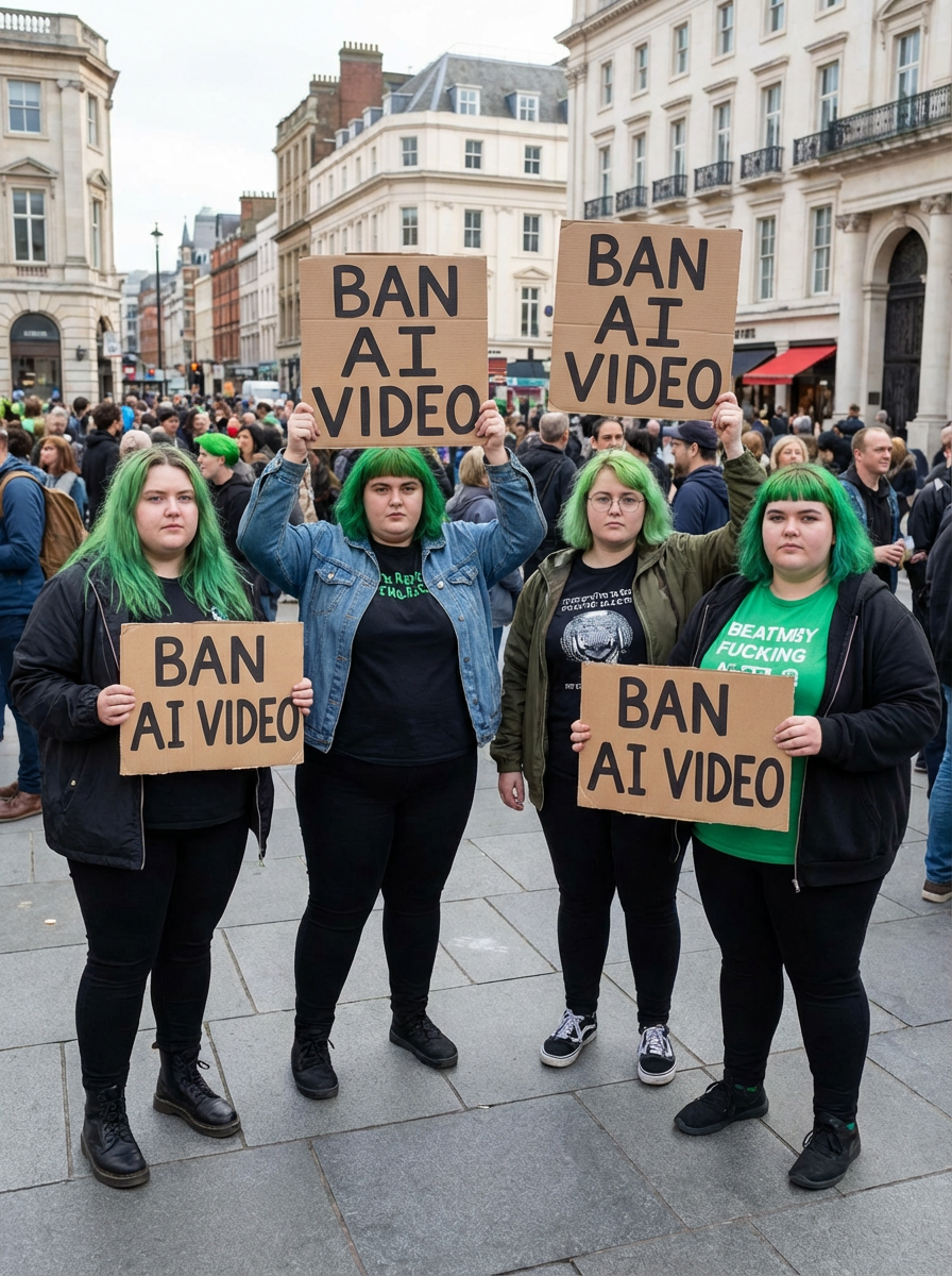 group of obese fat protesters in casusal clothes with green hair holding signs "ban ai video"