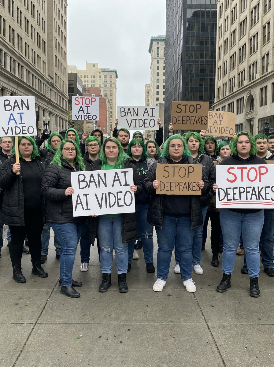 group of obese fat protesters in casusal clothes with green hair holding signs "ban ai video"