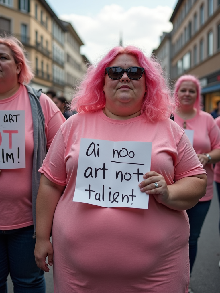 group of obese fat protesters in casusal clothes with pink hair holding signs "ai is not art, ai is not film, ai is not talent!"