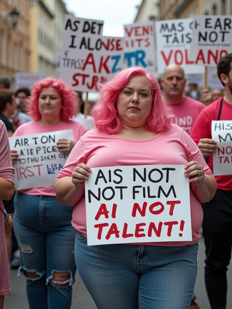 group of obese fat protesters in casusal clothes with pink hair holding signs "ai is not art, ai is not film, ai is not talent!"