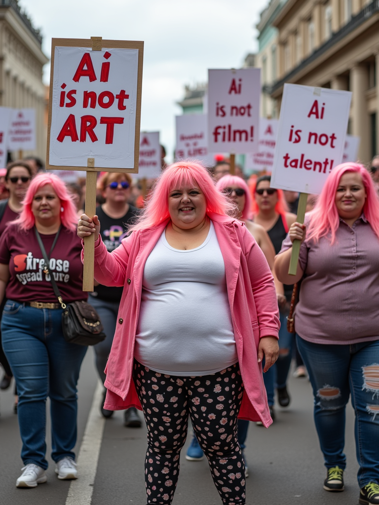 group of obese fat protesters in casusal clothes with pink hair holding signs "ai is not art, ai is not film, ai is not talent!"