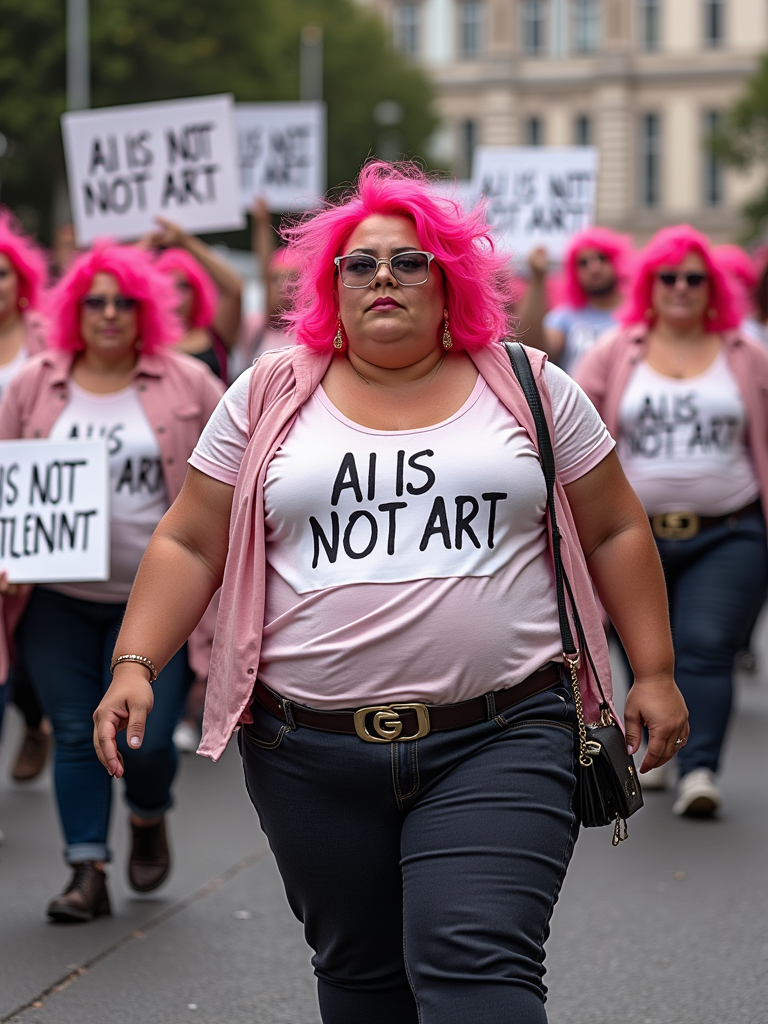 group of obese fat protesters in casusal clothes with pink hair holding signs "ai is not art, ai is not film, ai is not talent!"