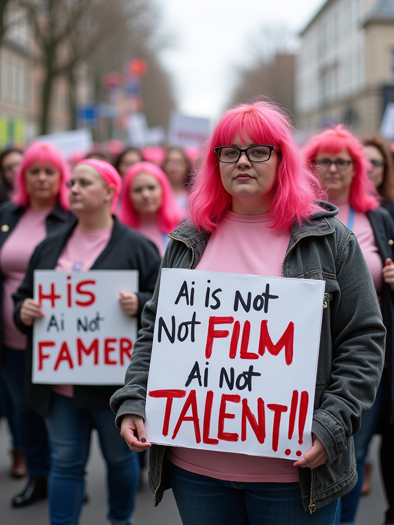 group of obese fat protesters in casusal clothes with pink hair holding signs "ai is not art, ai is not film, ai is not talent!"