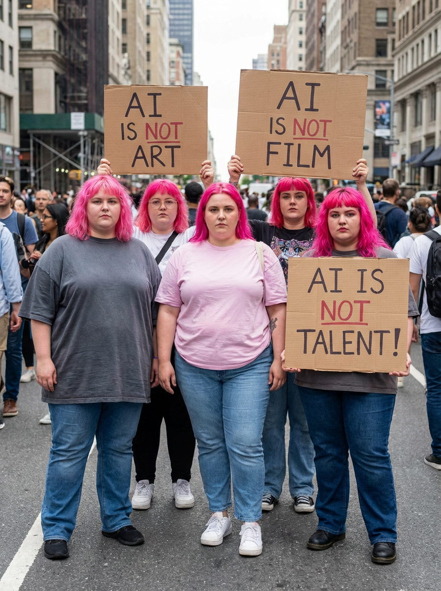 group of obese fat protesters in casusal clothes with pink hair holding signs "ai is not art, ai is not film, ai is not talent!"