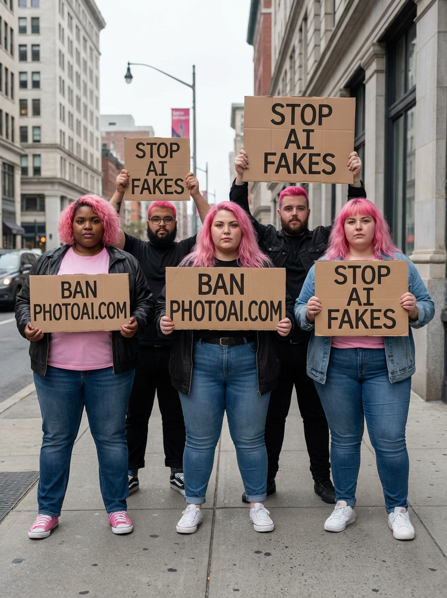 group of obese fat protesters in casusal clothes with pink hair holding signs "ban PhotoAI.com"