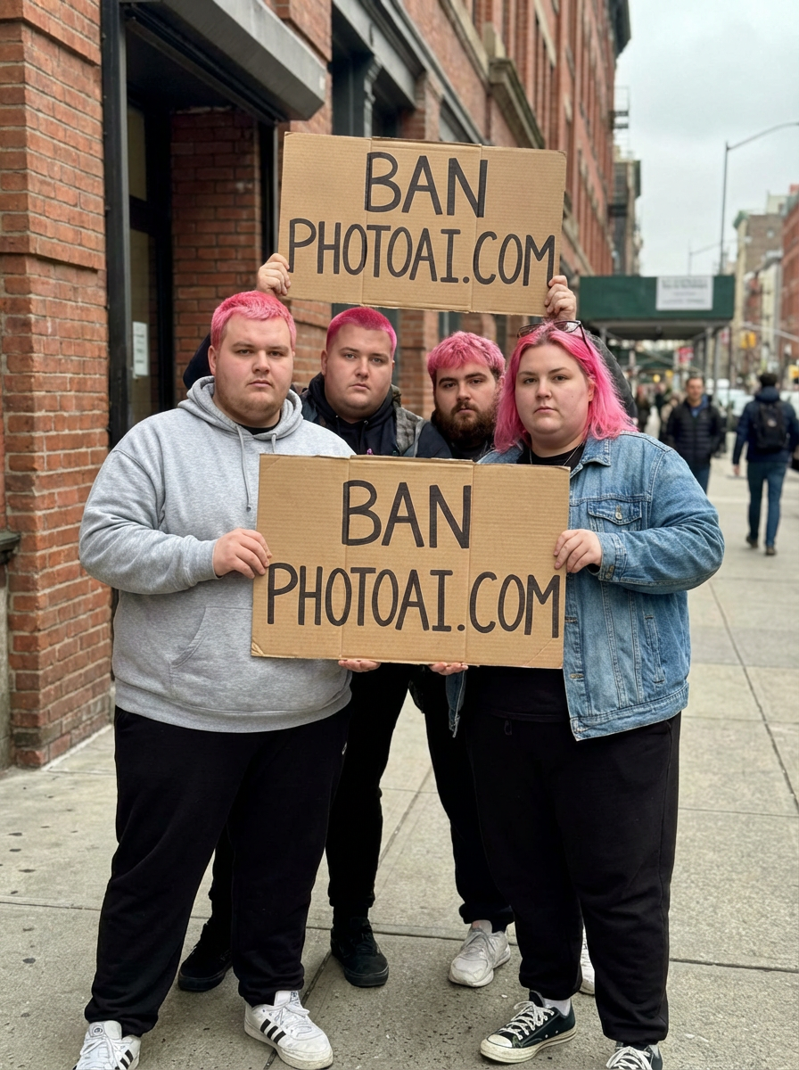 group of obese fat protesters in casusal clothes with pink hair holding signs "ban PhotoAI.com"