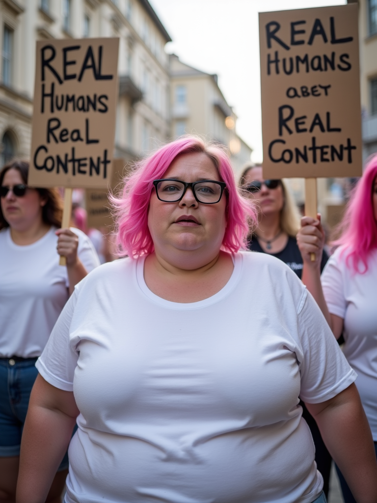 group of obese fat protesters in white t-shirt with pink hair holding signs "real humans, real content"