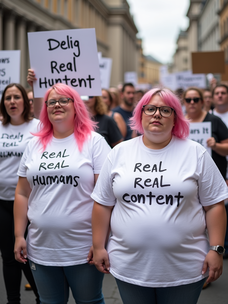 group of obese fat protesters in white t-shirt with pink hair holding signs "real humans, real content"