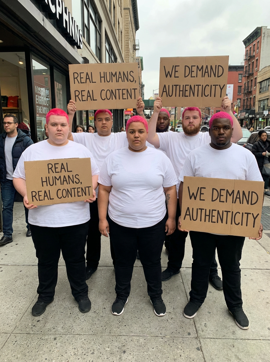 group of obese fat protesters in white t-shirt with pink hair holding signs "real humans, real content"