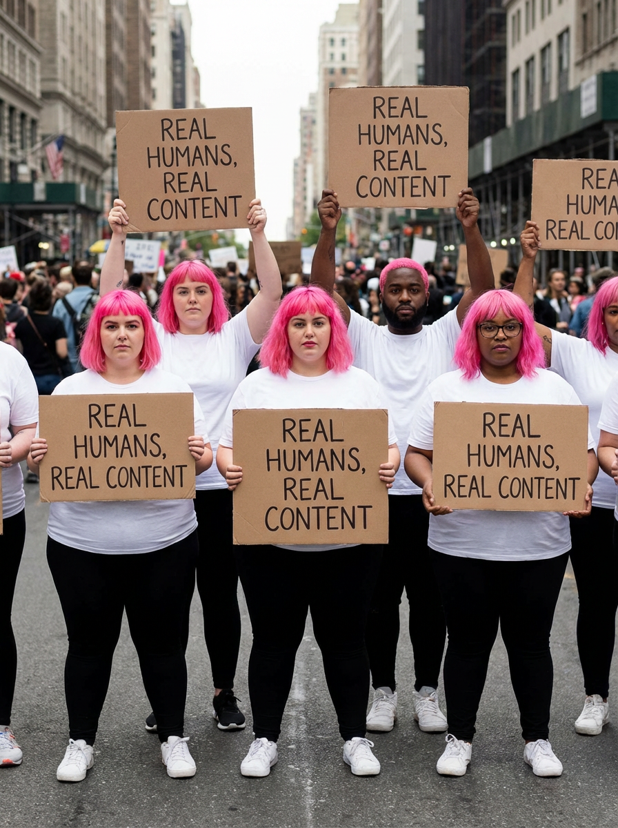 group of obese fat protesters in white t-shirt with pink hair holding signs "real humans, real content"
