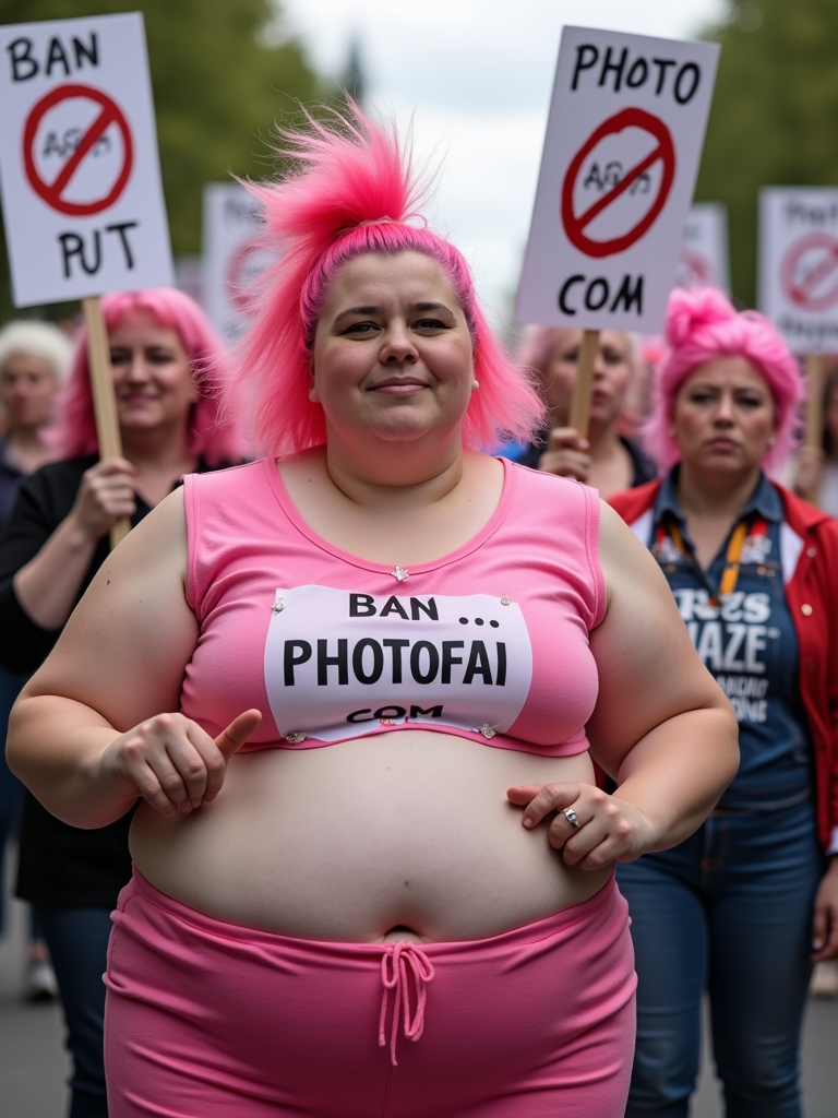 group of obese fat protesters with pink hair holding signs "ban PhotoAI.com"